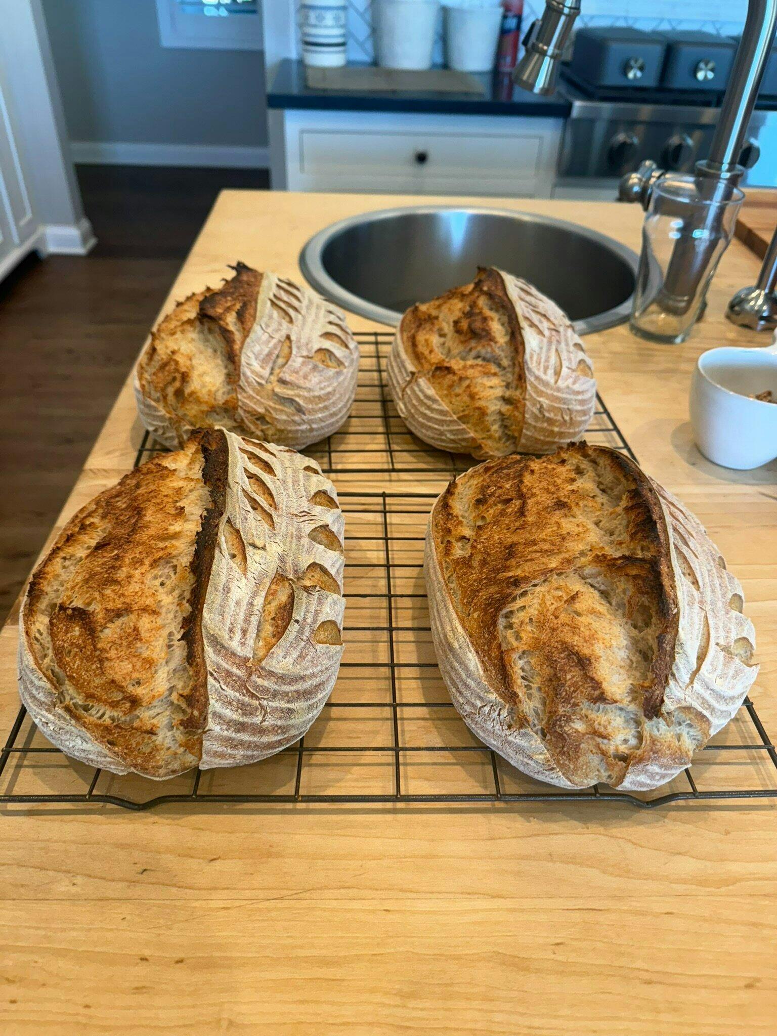 Two baking shells, batard and boule,  on the counter, accompanied by loaves of bread.
